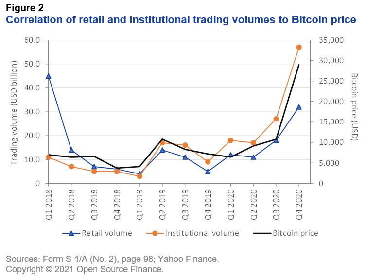 retail trading volume has been more influenced by volatility in crypto asset prices than institutional trading volume.