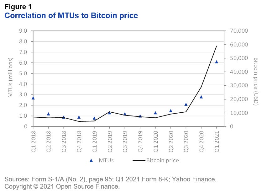 The largest component of Coinbase’s revenues—retail transaction revenues—is generated from its transacting base of retail users, referred to as Monthly Transacting Users (MTUs).5 The chart below shows that MTUs have generally been correlated with the price of Bitcoin in the recent past.