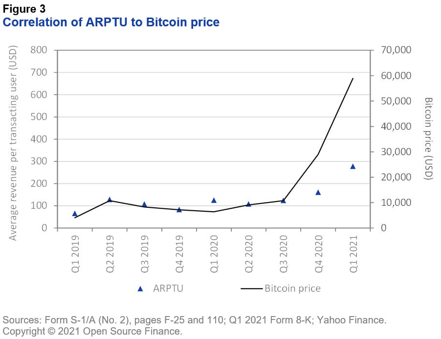 ARPTU is not a business metric reported by Coinbase, but I have calculated it as it is helpful for understanding the directional movement of transaction revenues. Average revenue per transacting user (or ‘ARPTU’) is calculated by dividing total retail transaction revenues by the number of MTUs over a given period. In effect, it models Coinbase’s fee structure without going into onerous detail.