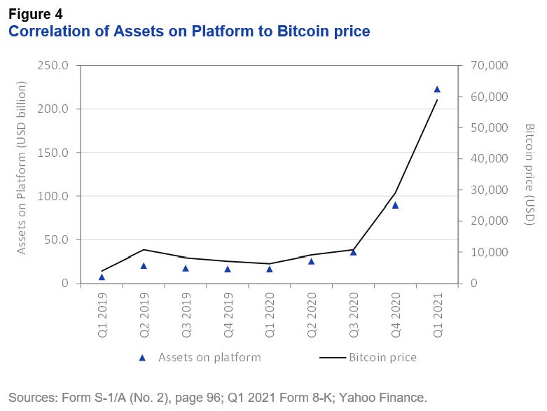 Key elements of Coinbase’s subscription and services revenue are earned on the value of the assets held on its platform, which are highly correlated with crypto asset prices